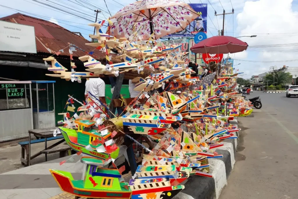 Kalau di Palembang, ada tradisi Telok Abang. Telur rebus yang dicat merah ditempel di miniatur kendaraan dari gabus, seperti mobil, kapal, atau pesawat. Mainan unik ini biasanya dijual di pinggir jalan menjelang 17 Agustus. Selain seru buat anak-anak, tradisi ini melambangkan semangat pembangunan dan kreativitas rakyat Palembang.