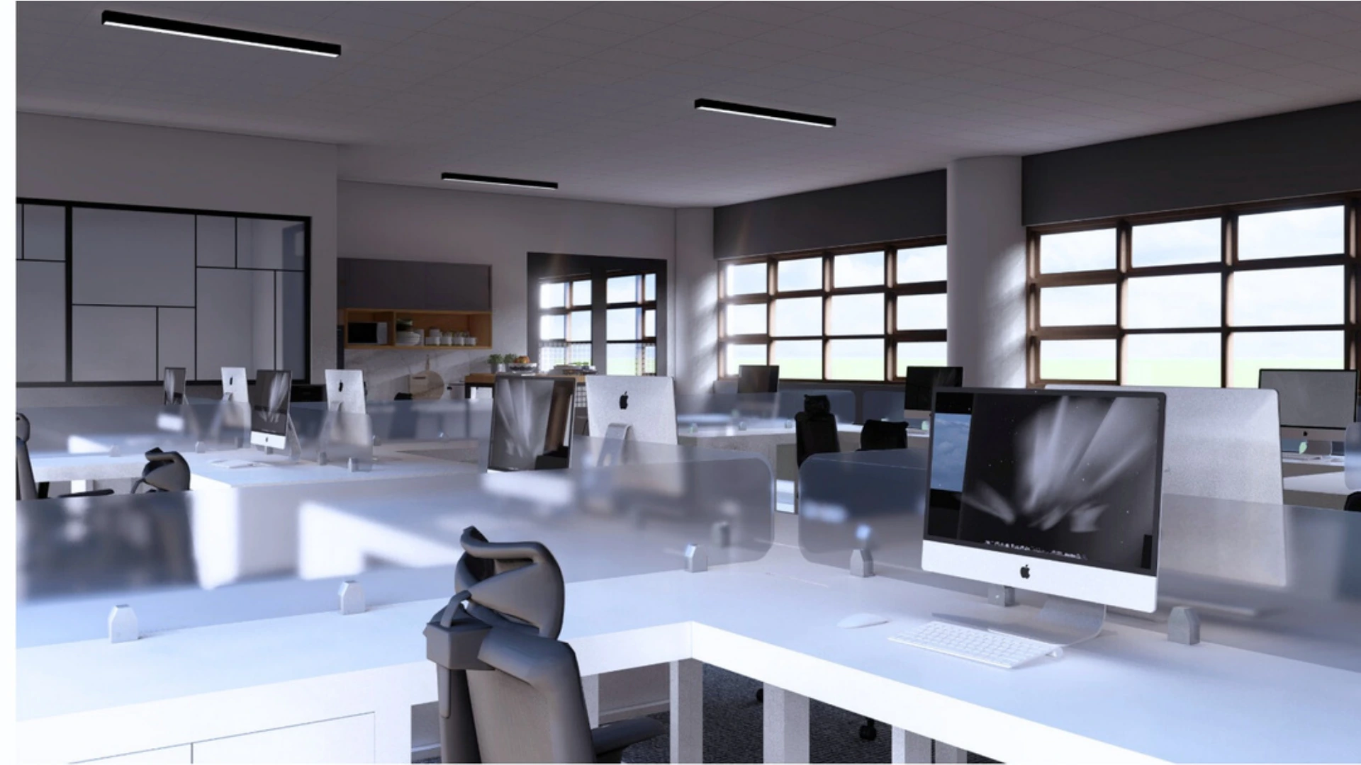 Desain jendela besar atau panel kaca agar cahaya matahari dapat masuk maksimal (siang hari tak terlalu banyak lampu buatan). Juga ventilasi silang agar sirkulasi udara tetap segar dan nyaman. -