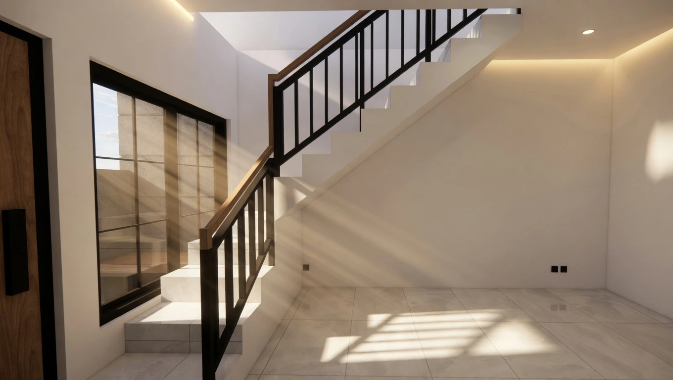 Penambahan railing tangga dan detail besi hollow memberikan sentuhan modern industrial sekaligus meningkatkan keamanan. Elemen-elemen ini menjadi bagian penting dalam membentuk karakter fasad rumah.