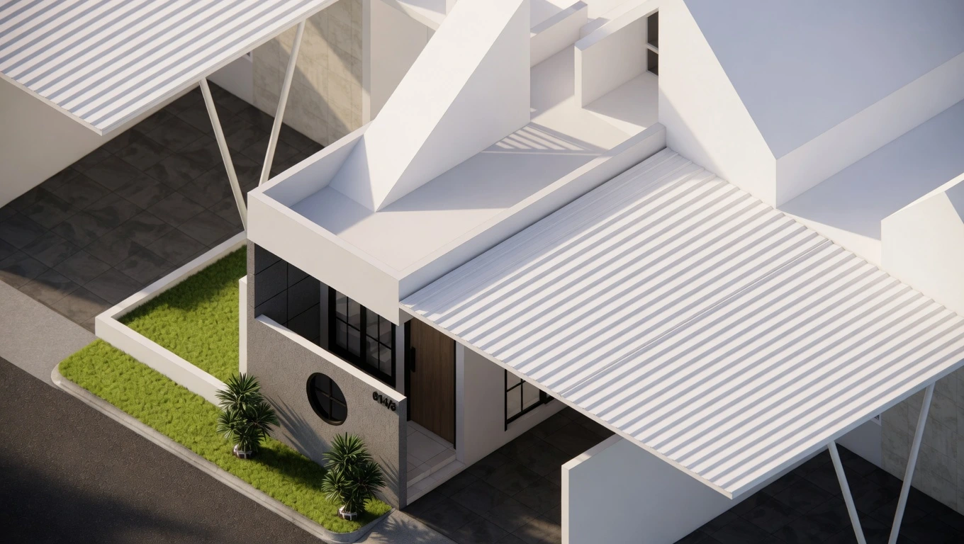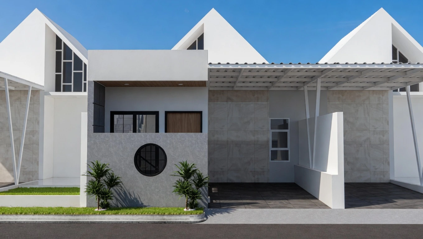 Penggunaan warna netral seperti putih dan abu-abu dikombinasikan dengan elemen garis yang tegas pada pagar, railing, serta detail arsitektural lainnya memberikan kesan modern yang kuat. Elemen tambahan seperti kanopi dan aksen struktur memperkaya visual tanpa terlihat berlebihan.